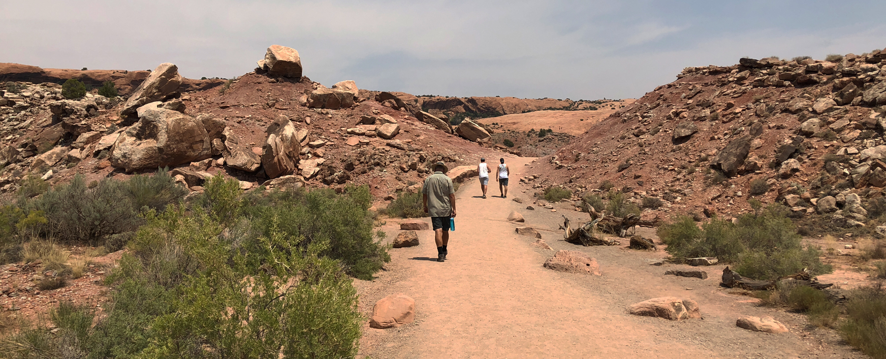 Der Weg steigt nun leicht an, und man gewinnt schnell an Höhe. Die Landschaft ist karg und Schatten eine Seltenheit. Also unbedingt genügend Flüssigkeit mitführen. Man sieht immer wieder Besucher, welche umkehren müssen oder sich mit letzten Kräften zum Delicate Arch hinaufquälen.