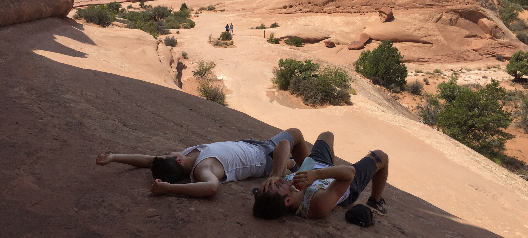 Kurz nach diesem Schattenplätzchen hat man die Möglichkeit, eine kleine Kletterpartie zu einem wohl namenlosen Mini-Arch zu unternehmen. Moni und die Jungs haben dies problemlos gemacht und konnten von dort oben einen ersten Blick zum Delicate Arch geniessen.