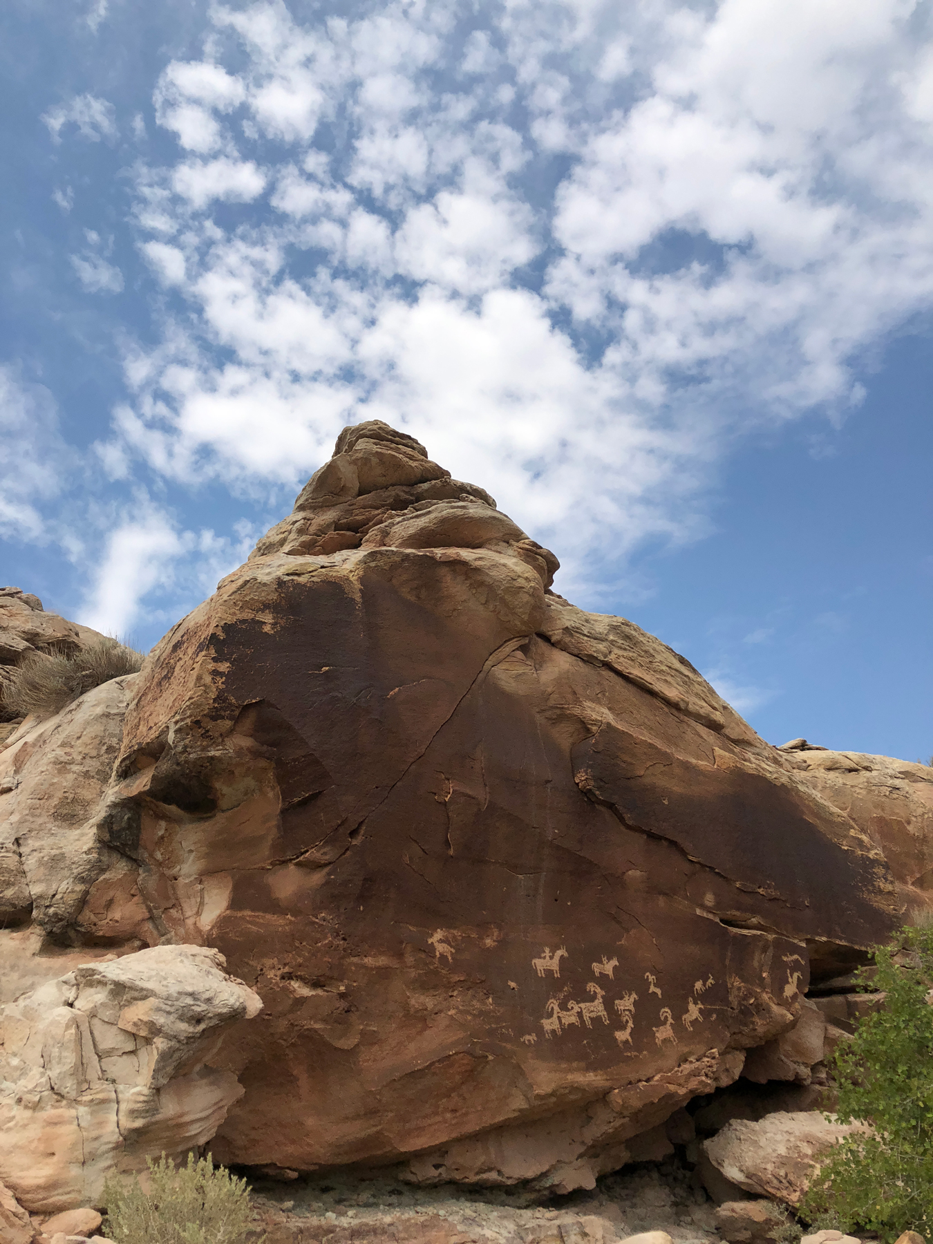Beim Rückweg machten wir noch einen Abstecher zu einem gut erhaltenen Panel mit Petroglyphen aus der Besiedlungszeit der Paiute Indianer. Erste Begegnungen der Spanier mit diesem Stamm gab es im Jahr 1776. Auch fand man Petroglyphen, die den Paiute zugeschrieben werden, da diese Jagdszenen mit auf Pferden sitzenden Indianern zeigen. Pferde wurden jedoch erst von den Spaniern während der Kolonialisierung eingeführt. Auch auf dem Panel im Arches National Park sind solche Abbildungen zu finden.