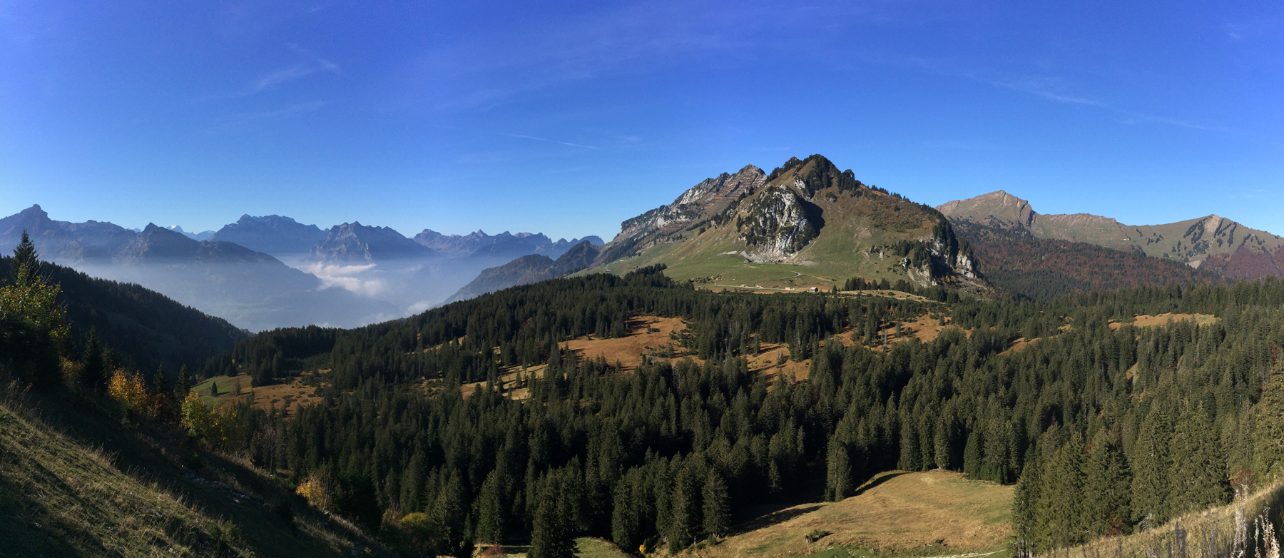 Der Amdener Höhenweg ist ein absolutes Muss für jeden Wanderer. Dies besonders an einem so schönen Herbsttag wie heute. Unten im Tal über dem Walensee etwas Dunst bis leichter Nebel und darüber eitel Sonnenschein und wolkenloser Himmel. Dazu die Herbstfarben der Wälder und Wiesen. Was will man mehr ? Die Temperaturen waren am frühen Morgen noch ziemlich frisch, was Danielle und mich aber nicht davon abhielt, frühzeitig aufzubrechen.