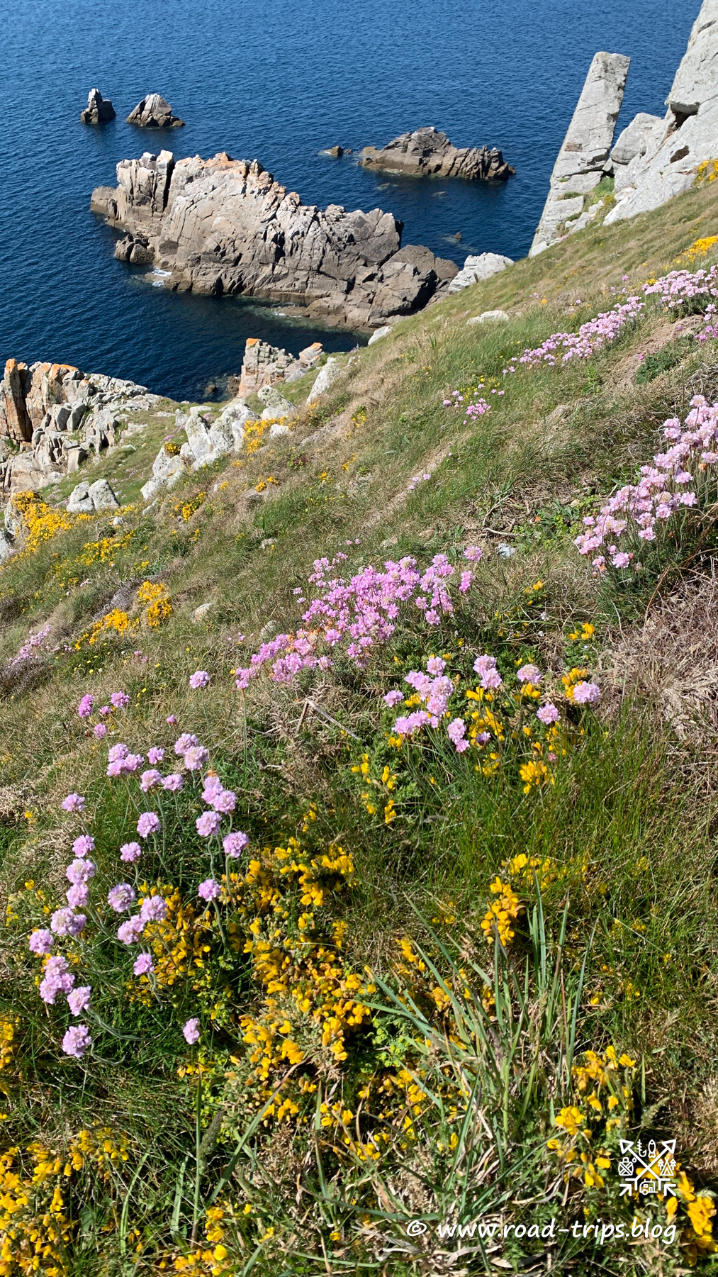 Nach diesem tollen Abstecher ins Landesinnere ging es nun wieder zurück an die Küste. Genauer gesagt an den Pointe de Brézellec im Norden der Halbinsel Cap Sizun. Ein wirklich schöner Aussichtspunkt mit Blick hinunter auf die schroffen Klippen. Wir standen inmitten der weiten und farbenprächtigen Blumenfelder. Das Meer war tiefblau gefärbt. Es gibt hier einen Wohnmobil Stellplatz für ungefähr 10 Fahrzeuge. Anschlüsse und sanitäre Anlagen sind jedoch nicht vorhanden.