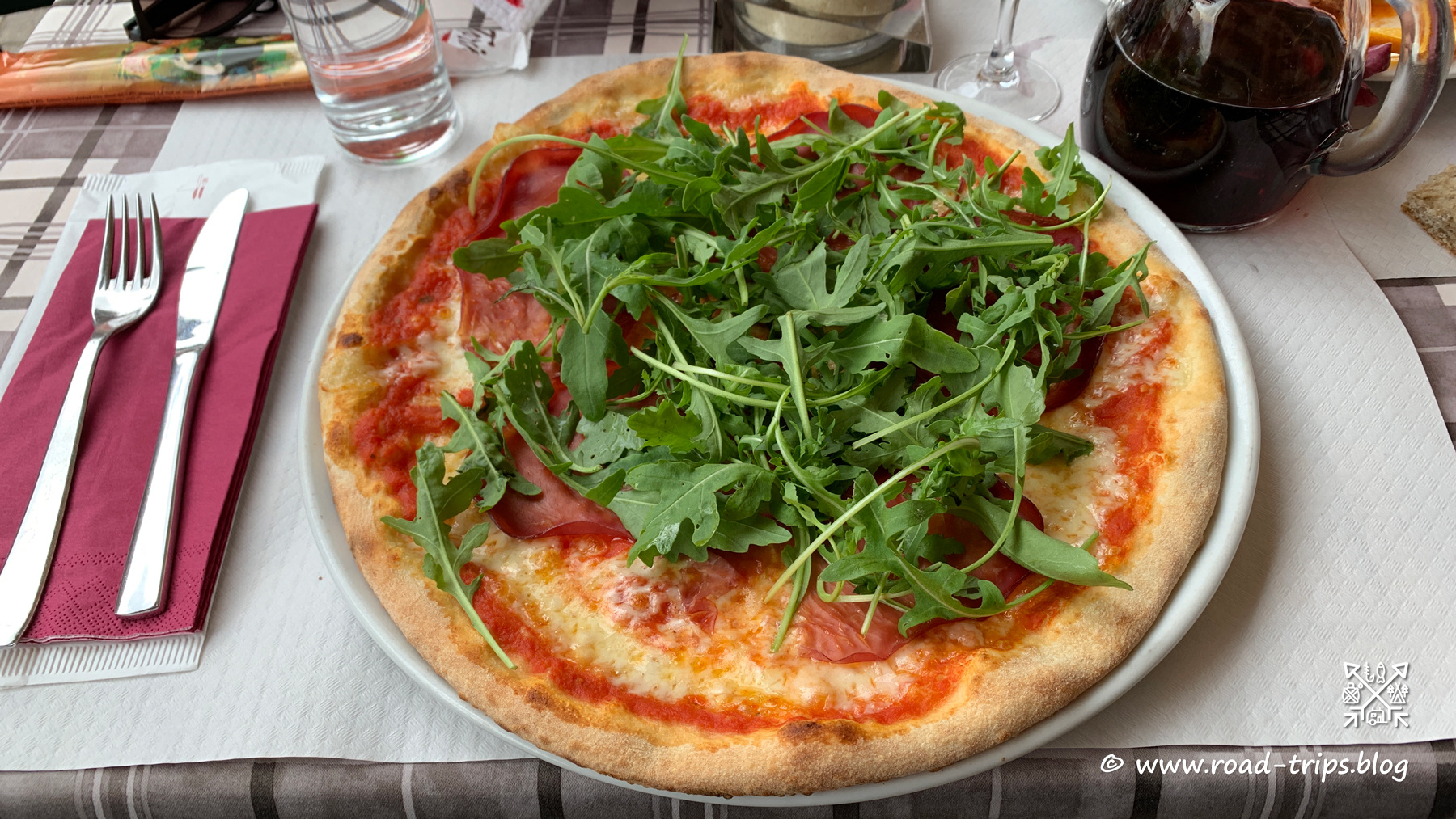 Auch Cortina d’Ampezzo war ziemlich gut besucht, und wir fanden mit etwas Glück einen der begehrten zentralen Parkplätze. Die Innenstadt war gut zu Fuss zu erreichen. Einen grossen Charme versprüht die Stadt mit ihren knapp 6’000 Einwohnern nicht. Einen Skiort stellt man sich eigentlich anders vor. In der Pizzeria Ristorante Croda Cafè schmeckte Pizza, Pasta und Rotwein. Gestärkt machten wir uns dann auf den Weiterweg in Richtung der Drei Zinnen, in deren Nähe wir die kommenden Übernachtungen reserviert hatten. Der Weg führte entlang zweier hübscher Bergseen. Da wäre als erstes der Lago di Misurina. Dieser liegt auf einer Höhe von 1’756 Meter über Meer. Am Westufer gibt es in Hotels einige Übernachtungsmöglichkeiten. Die maximale Tiefe des Sees beträgt 5 Meter. Der Lago di Misurina war im Jahre 1956 Austragungsort der Eisschnelllaufwettbewerbe der Olympischen Winterspiele. Es ist wohl zu bezweifeln, dass dies im Jahr 2026 wieder so sein wird. Der See ist nebst anderen Gebirgsketten auch von den Drei Zinnen umgeben.